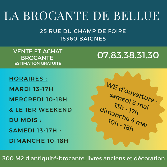 Recyclerie Brocante de Bellue, 25 rue du Champ de Foire, 16360 Baignes-Sainte-Radegonde. 15 min de Barbezieux, 25 min de Montendre, Archiac ou de Jonzac, 40 min d'Angoulême, 1h de Bordeaux.